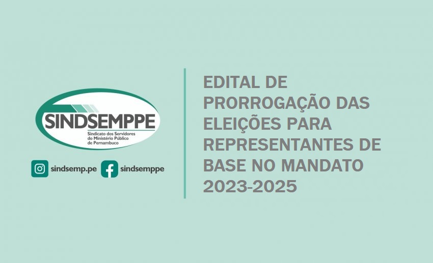 A Comissão Eleitoral do Sindicato dos Servidores do Ministério Público de Pernambuco – SINDSEMP/PE, eleita na AGE de 07/12/2022, nos termos da respectiva REGULAMENTAÇÃO DE ELEIÇÕES PARA REPRESENTANTES SINDICAIS DE BASE (CONFORME ART. 44 DO ESTATUTO SINDICAL), faz publicar o 2º EDITAL DE PRORROGAÇÃO DAS ELEIÇÕES PARA REPRESENTANTES SINDICAIS DE BASE, MANDATO 2023/2025, que passarão a ocorrer nos dias 19 à 21 de junho de 2023, mantidos os critérios, proporção, duração de mandato e demais condições, estabelecidos naquele REGULAMENTO, com as alterações de data e prazos adiante:
