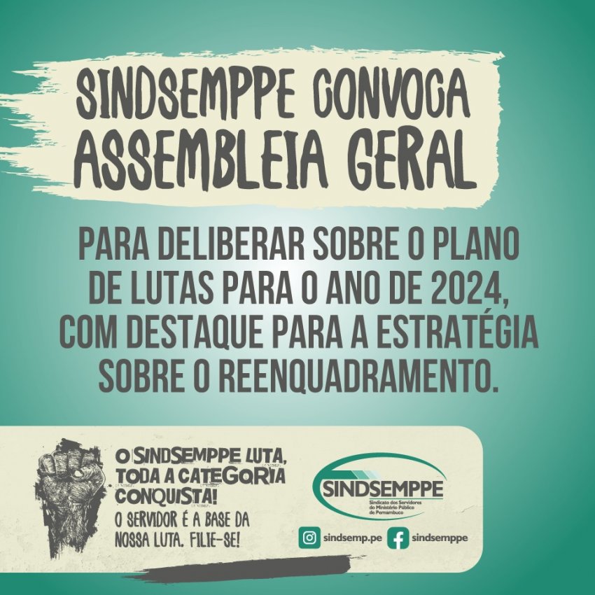 O Sindicato dos Servidores do Ministério Público de Pernambuco – SINDSEMPPE, CNPJ nº 03.927.440/0001-87, por meio de seu Coordenador Geral, convoca os filiados e filiadas para a Assembleia Geral Extraordinária. A AGE ocorrerá na modalidade híbrida (presencial e em formato virtual). Iniciando os debates no dia 19/12/2023 (terça-feira), com primeira chamada às 11:00h e segunda chamada às 11:30h, e encerrando às 13:00h do dia 20/12/2023 (quarta-feira).