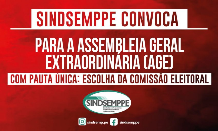 O Sindicato dos Servidores do Ministério Público de Pernambuco – SINDSEMP-PE, por meio de seu Coordenador-Geral, nos termos do art. 51 do estatuto social e em cumprimento às deliberações da Assembleia Geral Extraordinária finalizada no dia 12 de maio de 2025 e no uso de suas atribuições estatutárias convoca todos os filiados e filiadas para participarem da Assembleia Geral Extraordinária para a escolha da comissão eleitoral.