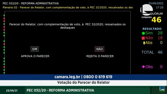 A Comissão Especial da Reforma Administrativa acaba de aprovar a Proposta de Emenda à Constituição (PEC) 32/20. Depois de substituir de última hora oito membros do colegiado, o governo conseguiu o número necessário de votos para que o projeto avance na Câmara dos Deputados, após mais de três meses de discussões. A aprovação foi por 28 votos favoráveis a 18 contrários. A Comissão inicia agora a votação de 21 destaques.